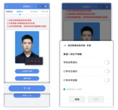 (4)照片初审。在拍摄完成或上传完成后,系统会生成带水印的初审照片,显示初审合格点击下一步,会弹出通知权限请求,请务必允许小程序发送审核结果、订单状态、订单异常提醒通知,避免对采集工作造成不必要的影响。