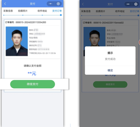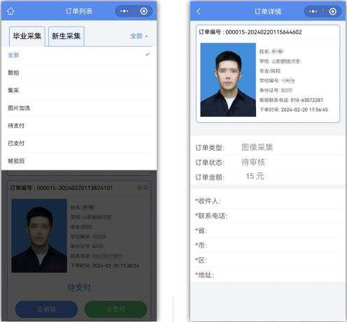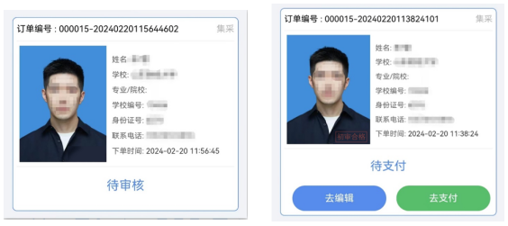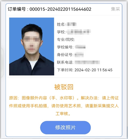 6.关于人工审核。支付完成后请同学关注个人订单页面,后台将在7个工作日内对采集的图像进行人工审核,如图像不符合采集标准,后台会驳回并给出重拍意见,同学可点击修改照片重新上传。