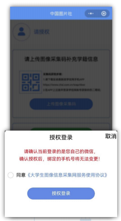 3.点击请授权。勾选《大学生图像信息采集网服务协议》,授权手机号登录。