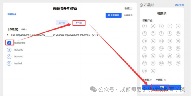 2、点击【答题】一点击【阅读完成,进入考核】,进入人脸识别页面,识别成功后进入到答题页面,完成一个题目后点击【下一题】,当答题卡区域全部题号变成蓝色表示全部完成,点击【交卷】完成本试卷的本次考核(作业,知识点测验练习,综合测评均需要人脸识别)