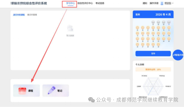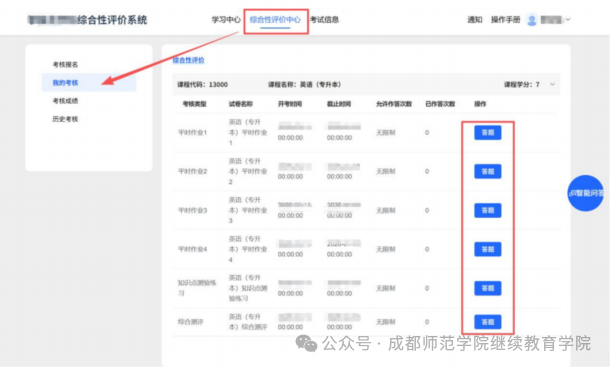 1、点击【综合评价中心】—点击【我的考核】,选择科目完成四次平时作业和知识点测验和综合测评,(一定需要在规定的时间内完成)