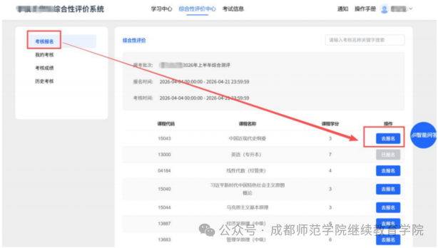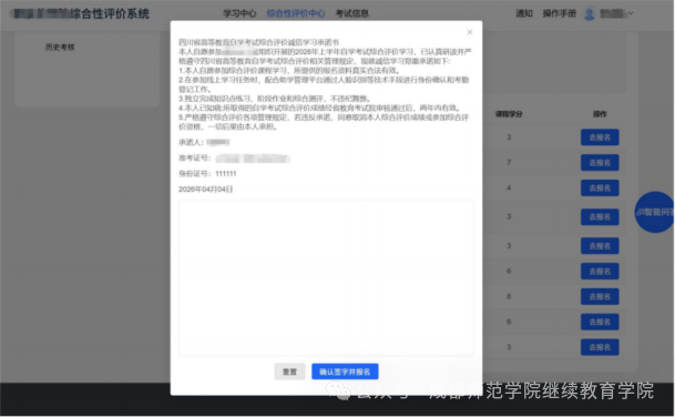 1、点击【综合评价中心】—【报名】,选择自己需要报名的综合性评价课程,点击【去报名】,进入到承诺书签署页面。