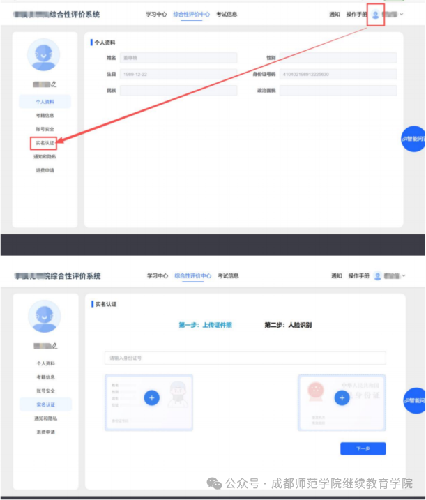4、登录后点击头像位置,找到【实名认证】按照步骤完成认证:填写身份证号码-上传身份证正反照片一点击【下一步】-点击【开启】进行人脸识别