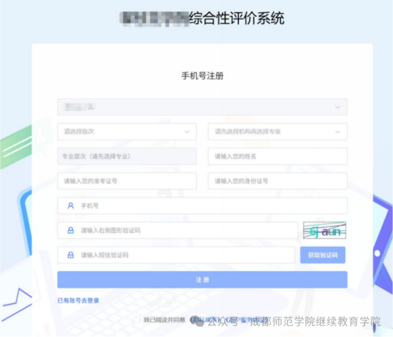 1、按照要求填写信息,批次是注册批次,专业选择自己注册的专业、姓名、准考证号、身份证号码和手机号一定要填写正确,基本信息填写完成后输入验证码获取手机短信验证证码,填写验证码后,勾选"同意隐私政策和用户服务协议"后,点击【注册】完成注册。