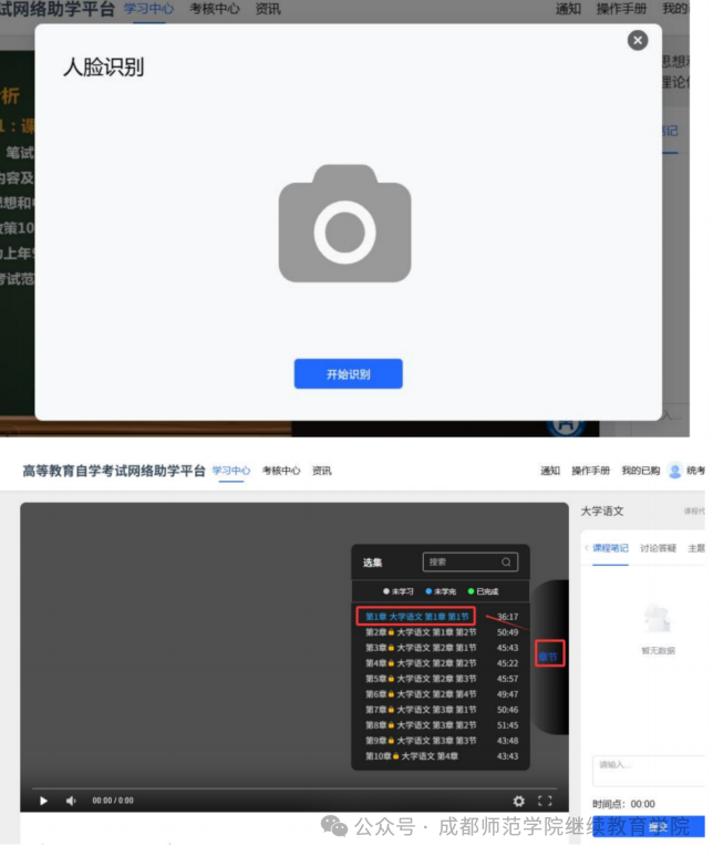 4、点击当前学习的课程名称,进入视频学习页面,按照目录顺序进行学习,课程每个章节学习时需要进入人脸识别,识别成功后进入视频学习播放页面。