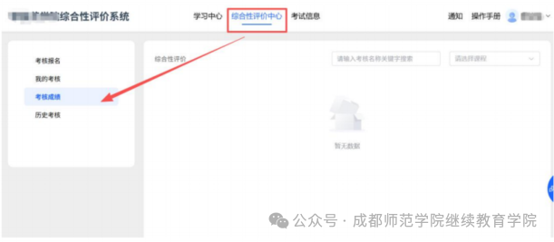 3、在规定的时间完成所报课程的全部考核试卷等待成绩发布后进行查看成绩,点击【综合评价中心】—点击【考核成绩】,查看本次的各项成绩和最终成绩。