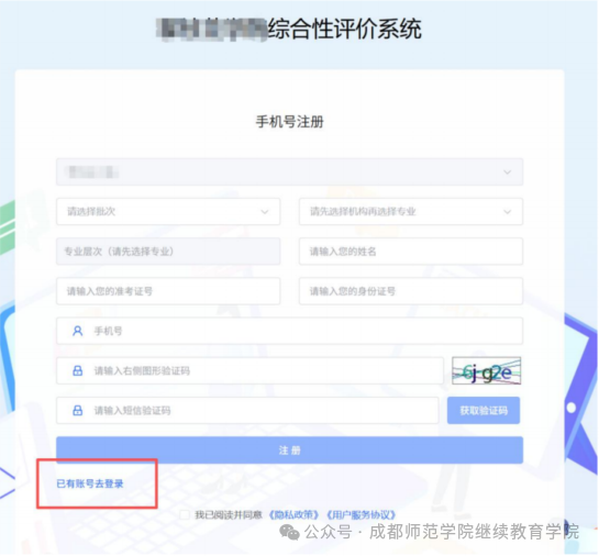 点击左下角"已有账号去登录",输入正确的账号密码,账号为身份证号,密码默认为123456,如之前有重置过密码,请使用重置后的密码登录,填写完账号密码后,勾选"同意隐私政策和用户服务协议"最后点击【登录】。