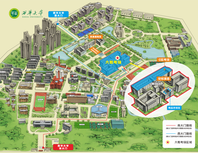 本次考试区域设在学校第六教学楼C区,考生从第六教学楼B区入口进入考场,导航地址为“西华大学6B楼”。从西华大学各大门到考试区域步行预计20分钟左右(具体路线见考点示意图)。