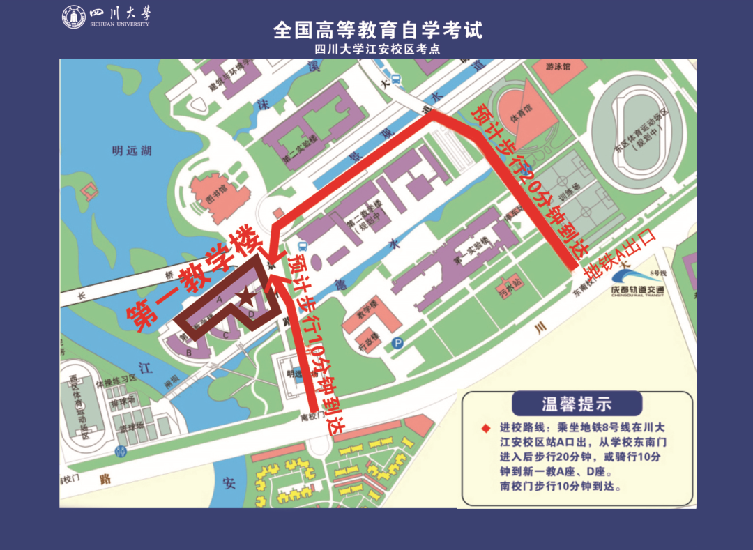 乘坐地铁的考生,考场离学校东南门距离最近,请乘坐地铁8号线在“川大江安校区站”下,A口出,东南门在A口西侧10米,从东南门进校后按照路线指示牌步行(15—20分钟)或骑行(8分钟)至考场。